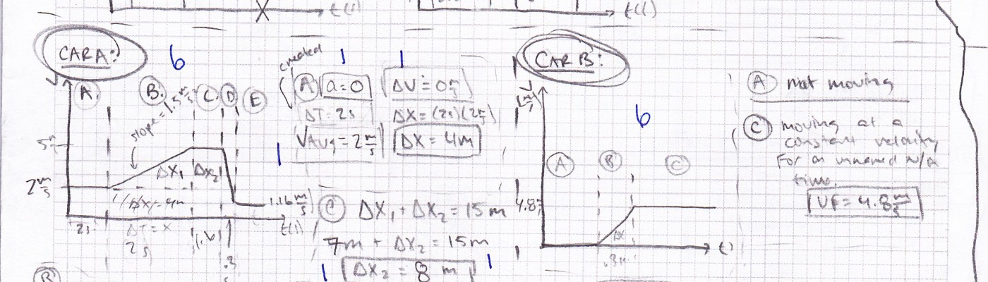 We start to plant the seed of this concept in the third unit (Constant Acceleration Particle Model) with “baby goal-less problems.” At that point, they can really only draw the kinematics graphs. And if there is enough information to solve the problem, they can probably only calculate about two pieces of information about the problem. They usually feel uncomfortable that there isn’t a specific question asked, but they also soon realize that there aren’t a lot of solvable questions to ask given the information. They just don’t know a lot of physics yet. I tell them that later in the year I will be able to give them a situation like these and they will fill up an entire page with physics, and that seems unlikely to them (at the time).