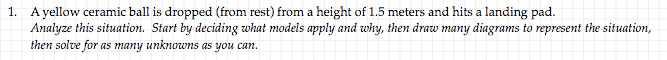 For the first couple of units with these problems, the first goal-less problem starts with a lot of structure. It gives the statement, then has parts (a), (b), and (c) spaced out on the page. The (a) is “What models apply to this situation and why?” The (b) is “Draw at least four diagrams/graphs to illustrate the situation. Choose the diagrams and graphs that you find most useful.” The (c) is “Using the models you have chosen, solve for any unknown quantities. Use more than one method to find the same answers whenever possible. Show your work and use units. Alway start with a variable expression.”
