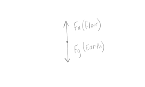 Once we have the system schema, we know all of the forces acting on the hover disc. The free body diagram is where you represent the object as a particle and show the forces on the object with their directions. Remember that we represented the object as a particle (a dot) on our motion maps back in CVPM. So. Shrink the object to a particle. And what’s one force acting on the hover disc? (Gravity) What direction? (Down) Down toward the center of the Earth. What object exerts it? (the Earth) We’ll write that in parentheses so we know what object exerts each force. Great. What’s the other force? (Normal force from the floor) Crunchy force, great. What direction are the atoms being crunched? (Umm… perpendicular) Perpendicular to what? (To the floor) So that’s up or down, right? (Okay, up, because they floor is pushing up from underneath it.) So that’s it, yeah?
