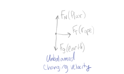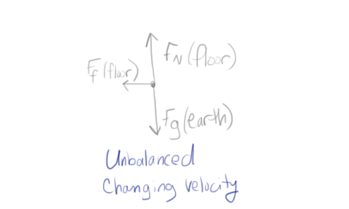 Is anybody seeing a pattern here? [Stand back. As you go, you’ve kept one spot on the board where you keep erasing and drawing a new system schema, but the FBDs have stayed up in order across the rest of the board. Let the students look at them all together and see if there’s a pattern.] (Someone will, without realizing that they’re saying something really important, casually and quickly say, “When the forces are balanced, it’s constant velocity, but it changes velocities when the forces are unbalanced” or something else very similar.)