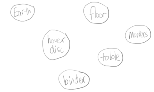 So a System Schema shows the objects that are interacting and what types of interactions they are having. What objects are interacting with the hover disc? [As kids start saying things, write objects on the board and draw circles around the names. If the kids don’t introduce enough random objects, start adding some of your own. You need way too many objects for this first system schema so that they start building an idea of what objects are minimally necessary.] Great.