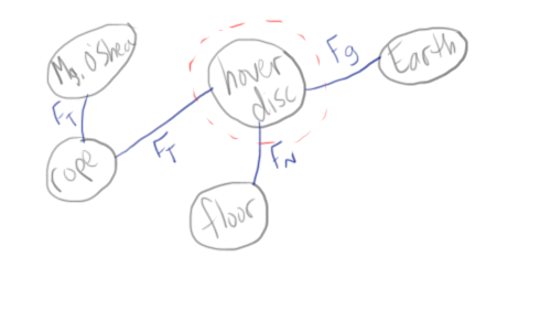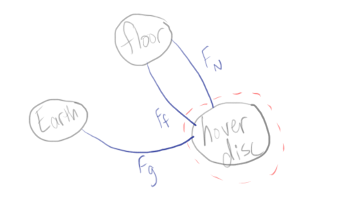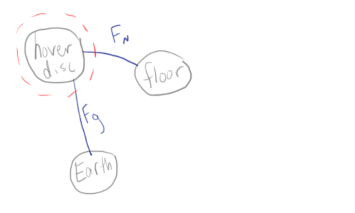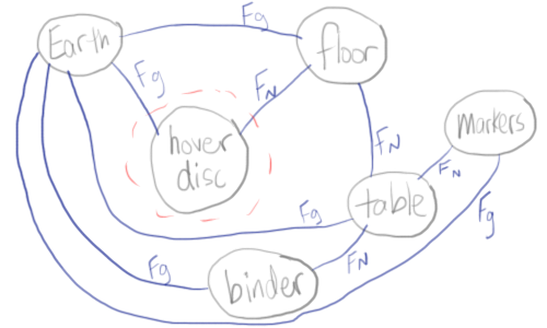 Why don’t you guys get a couple of steps ahead of me in drawing the system schema. I’ll give you a couple of minutes, then you’ll help me draw mine on the board. [Wait a couple of minutes, then get them to start telling you which objects to draw, then which connections to make. Purposely put the objects in a different arrangement this time so that they see there isn’t one correct placing to draw. Also, brief discussion about how we don’t need to make connections that don’t involve the hover disc, but that it is okay to do that if you need that sense of completeness to fulfill your physics zen.]