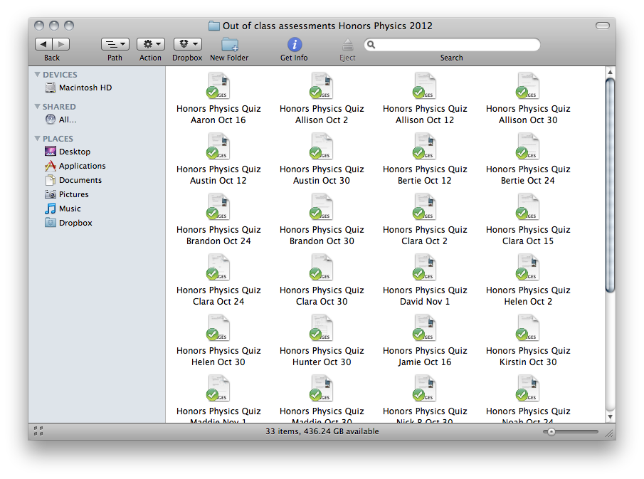 Another nice benefit of creating the tests ahead of time has been that I can see a history of which questions I’ve given to each student. I can also quickly and easily find a problem from someone else’s test and copy it into their new file when I’m making up the tests each Saturday. I am keeping all of the files named with the student’s name and the date of the extra test in one folder like so: