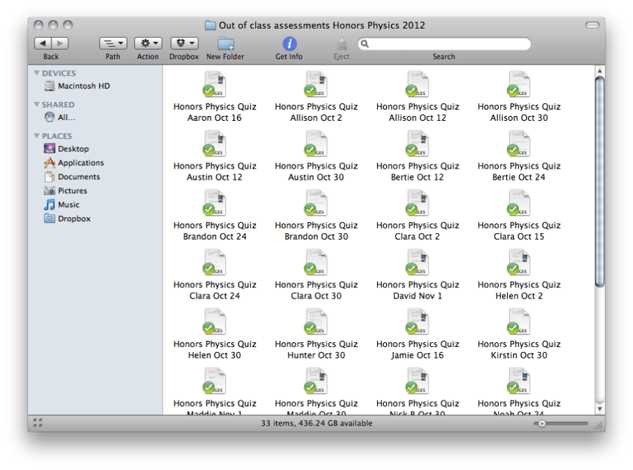 As far as Evernote, it is working marvelously. I have always had one note per student (well, at least the past three years) for keeping all of their comments in one place. This is the first year I’m putting the scanned tests in there as well. So far so good, even for kids that have a lot of documents in their note already. I do have a new MacBook Pro (school computer), for what it’s worth. It is really nice, though, that when you drag the PDF into the note, you can have it show up as an image right there. You can reduce it to an icon (that you click to open the document), too, though, which might help with loading if that became an issue (or with clutter if there were too many documents to be useful). Haven’t had a problem with the iPad, though I hardly ever use it for Evernote anyway. You don’t have to sync the notes to the iPad, though, right? You could choose which notebooks to sync and put the student notes in a different notebook.