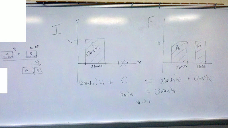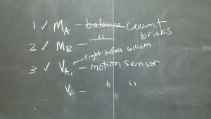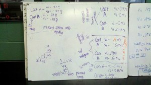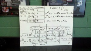 The kids brought in their whiteboards and markers, jotted down the data, and set to work looking for a pattern. We realized now that we had 6 variables (v_{iA}v_{iB}v_{fA}v_{fB}m_{A}, and m_{B}), and we needed to find a way to relate all of them to each other. The groups responded differently. There was a great deal of concentration, a flurry of activity, some blank stares, and lots of drawing diagrams and trying things out. I try to stay out of the way.