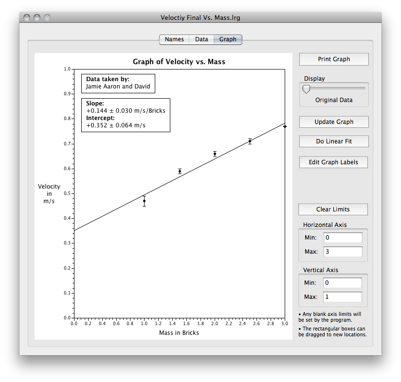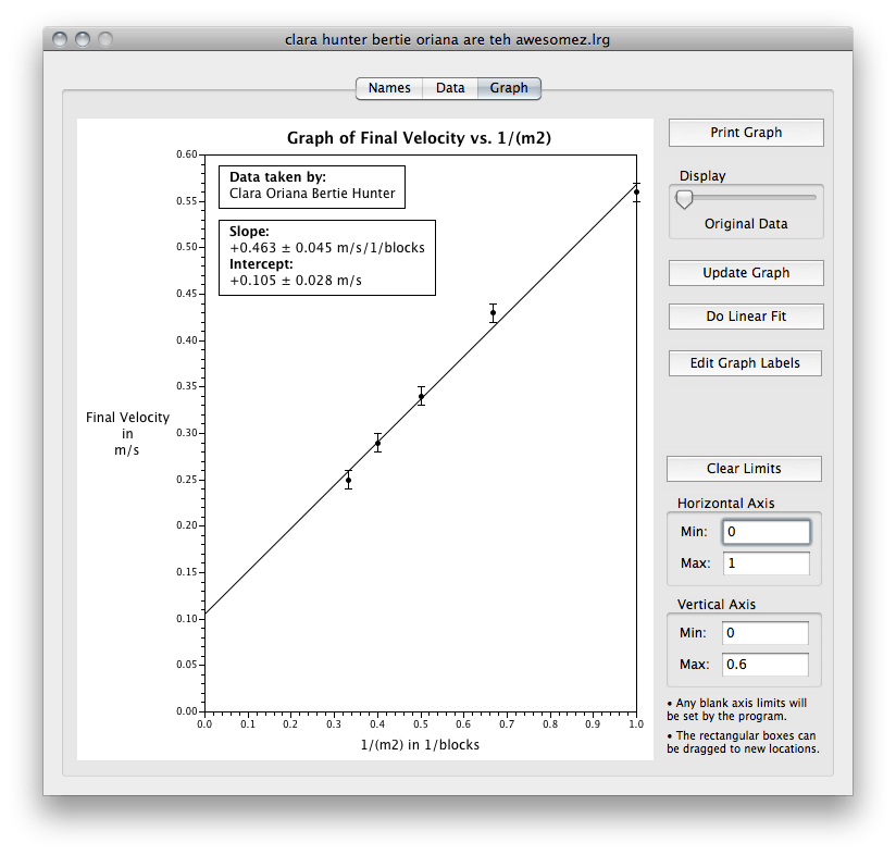 Meh. It’s sort of linear, maybe, with a cruddy data point in the mix. Or maybe two cruddy data points. Or something. But it doesn’t look much like any shape that we know. And, hey. Shouldn’t it go through 0,0? If there was no mass on the cart, would there be any kind of final velocity anyway?