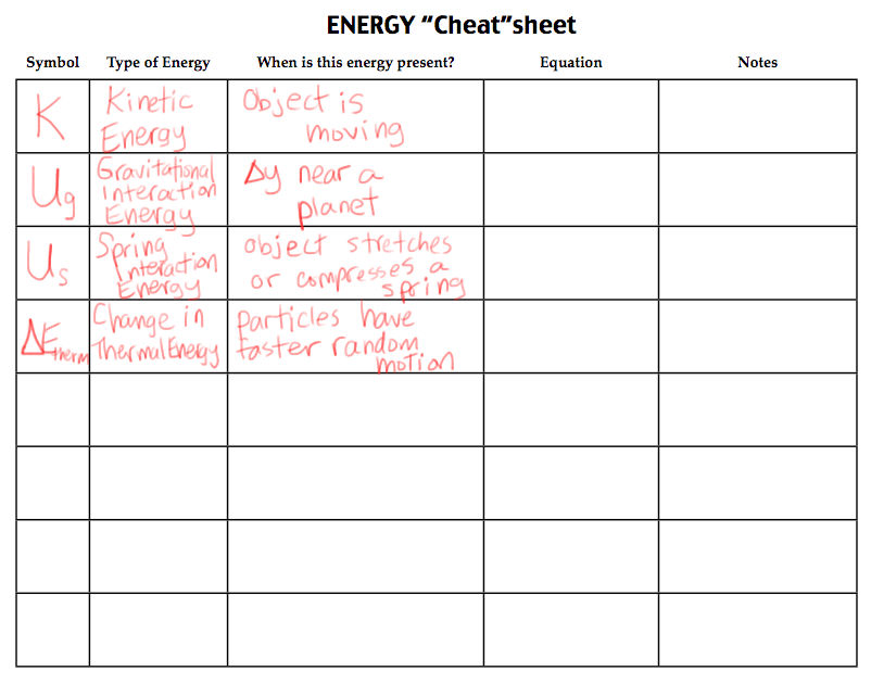 We won’t need the equations just yet, so we’ll save that column for later. Some symbols, names, and the beginning of an understanding of what the type of energy is would be helpful to start.