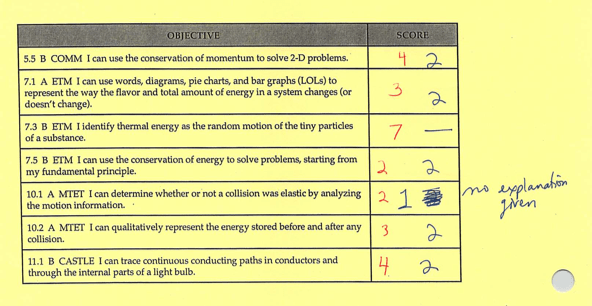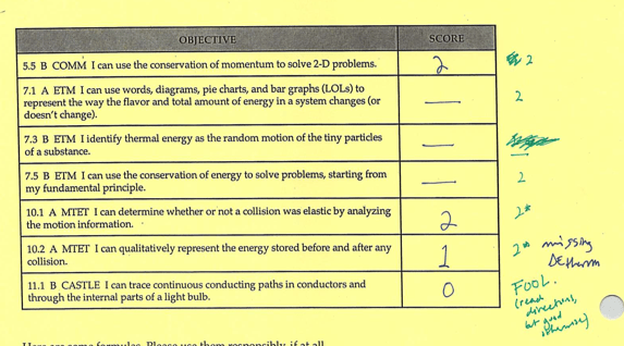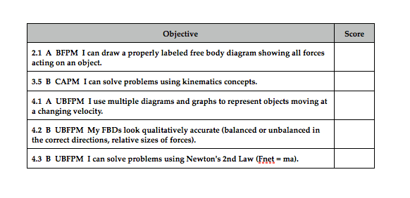 Quick note about the scores above: The dashes mean that I didn’t take data on that objective (many possibilities—they didn’t have time to finish the quiz, they misinterpreted the question and the question they answered didn’t give me good insight about their abilities, they made a mistake that I deemed to be related to a harder skill (like, say, a mistake in drawing a diagram that was due to their misunderstanding about circular motion, not about the directions of forces), I mistakenly put that objective on the back without any questions relating to it, etc.). For more about 0’s, 1’s, and 2’s, read the more detailed information about my whole grading schema.