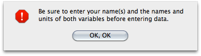 I’ve seen students push cancel 4 or 5 times without reading the words (usually only on the first occasion they have tried to linearize a graph in LinReg). Eventually, they will decide to find out why they can’t get back to the graph tab, and they will realize that they know how to answer the question posed in the pop-up box.