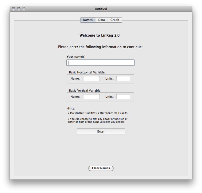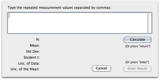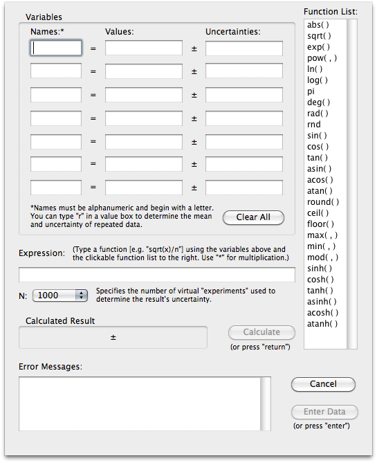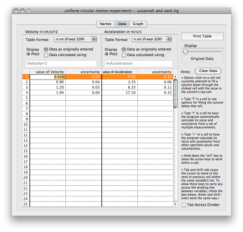There are also a couple of special ways of entering more sophisticated data. One is a tool for dealing with multiple trials of each data point (my students usually just averaged them and found the range on their own before inputing the data). This feature is accessed by pressing r while in the data table.