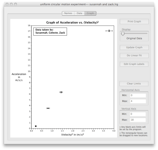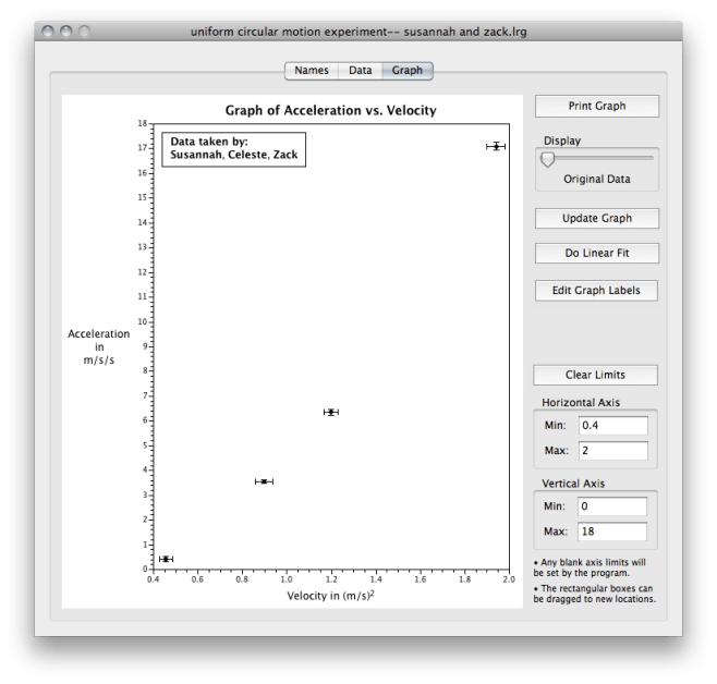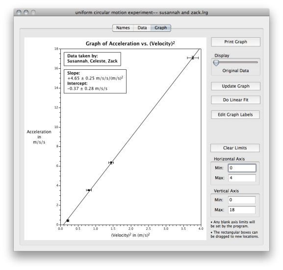 I found it this past summer either through the Global Physics Department talk or through John (see the mention in his Physics Teacher Camp post). I was anxiously looking for an alternative to Excel for my Honors Physics students. Excel was overwhelming to them, made them dread doing experiments (even though they don’t write lab reports), and took seemingly endless amounts of time (with lots of repetition) to help them learn to do any of the non-intuitive things they wanted to do to analyze and graph their data. Worse, I wasn’t even having my regular Physics! students try to graph data on a computer, nor was I ever asking them to linearize any graph.
