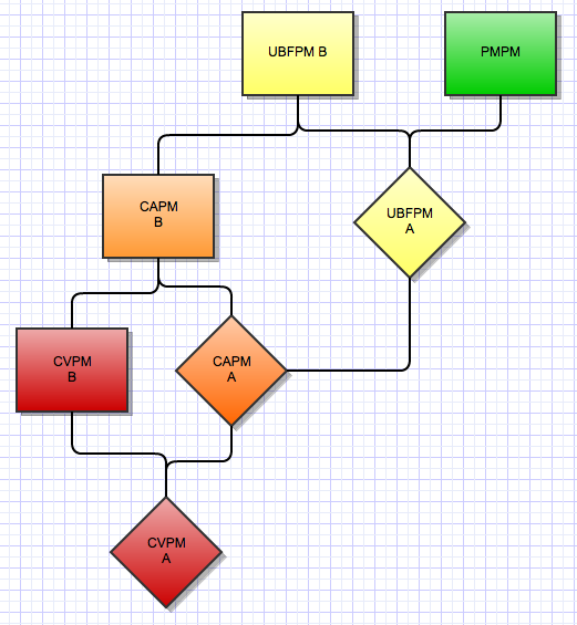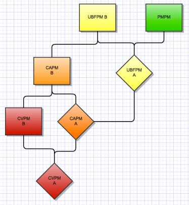 • You need a way of keeping track of each student’s score specifically in each part of the tree structure (I think this could be accomplished without too much trouble in either AG or BH). So. Here’s the conjunctive-SBG part snuck into points clothing (bear with me, this will take a few bullet points of setting up): In order to be eligible for any particular quiz, they must have mastered all of the bundles on which it depends (per the tree). So to take a CVPM B-level quiz, they must have current mastery on the CVPM A-level quiz. To take a PMPM quiz, they must have current mastery on the CAPM B-level quiz (and the CAPM/CVPM A-levels, and maybe others, depending on the specifics of your tree).