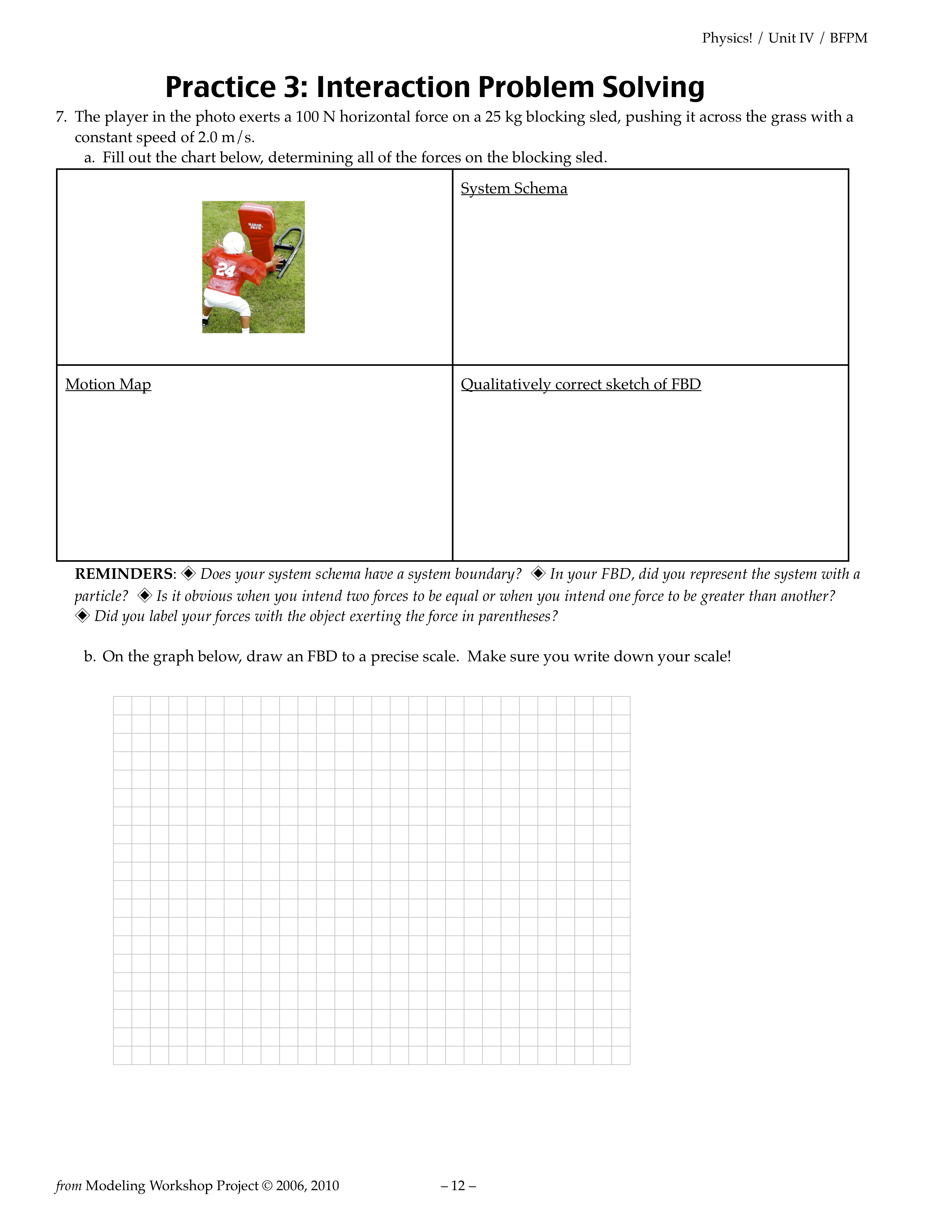 After the paradigm investigation in my balanced forces unit, we start off with a truly excellent 5-page activity that I got from Matt Greenwolfe. It’s 5 versions of the same problem with just slight changes to the situation each time. It essentially involves a box that you first push along a rough floor, then let go of while it is already moving. Students draw system schemas, FBDs, and velocity-vs-time graphs for each stage and altered scenario. We whiteboard them as board meetings (every group whiteboards the same problem, then we circle up and argue it out until we come to a consensus).
