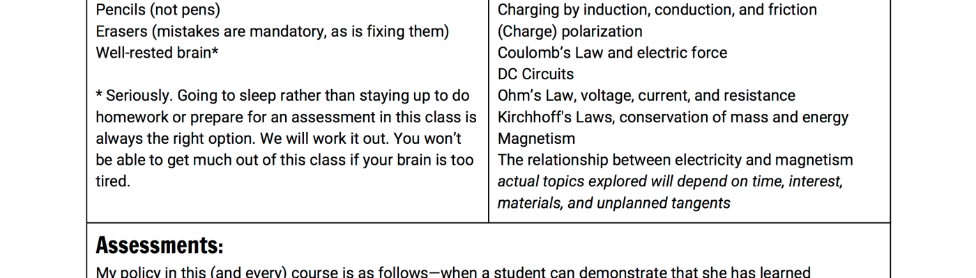 The next section of the class starts on Monday, and I’ve been spending some time cleaning up materials to prepare for it. I made a new course handout and incorporated some updated advice from former students (which I’ve written about before) on the back of the page. A lot of this set of advice comes from this past trimester’s group of sophomores who gave me a lot of great feedback a couple of weeks before their final assessment. They were particularly fond of the grading system and the way that they saw themselves as being able to learn something challenging that they didn’t necessarily expect they could do.