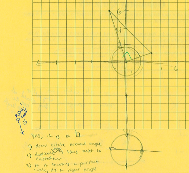 First, a kid duplicated the triangle by duplicating the angles. She argued that when you added the other two angles together, they seemed to add to 90º, making the case for a right triangle. (Not 100% there yet in her argument, but on a cool, unexpected track!)
