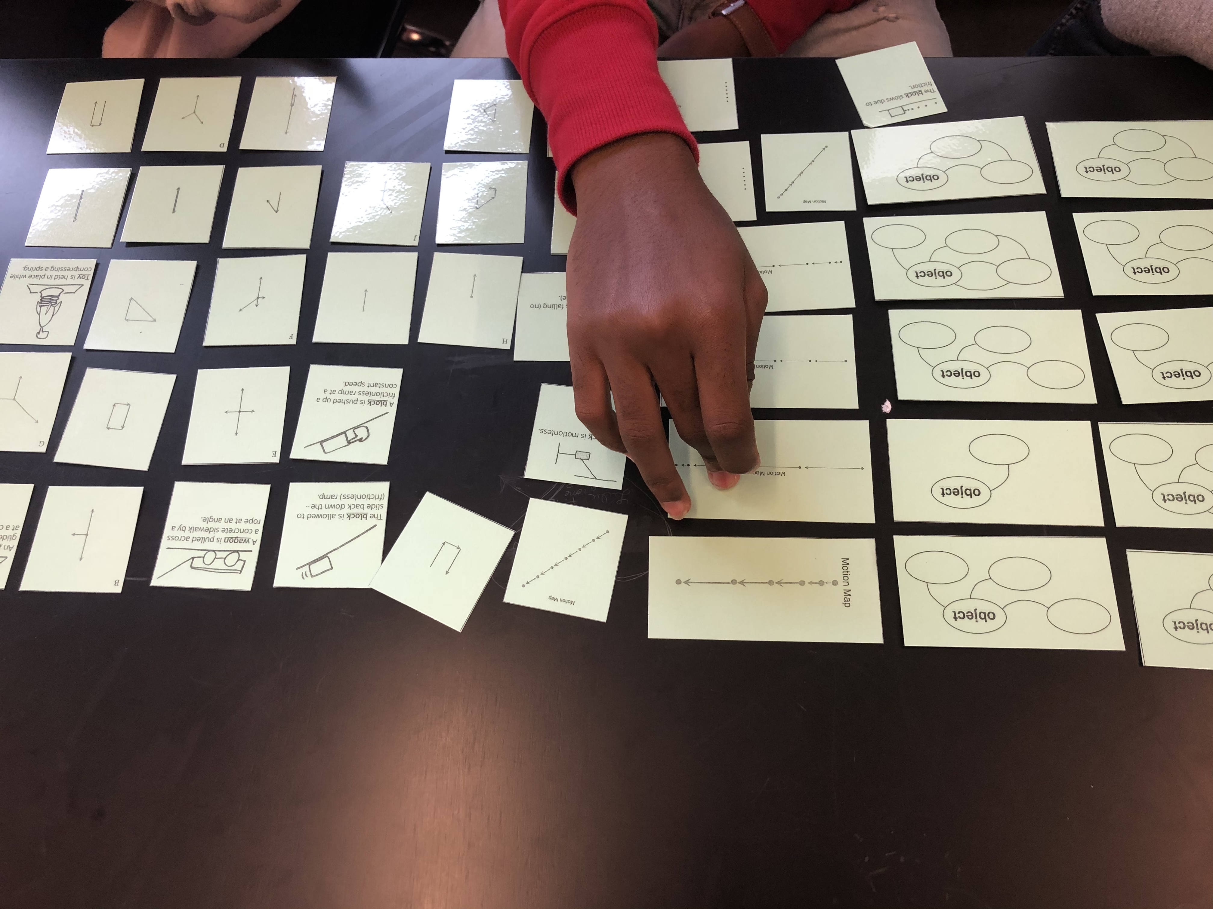 There are 4 (or 5—I will get to that) types of cards: situation descriptions with pictures, FBDs (just arrows, nothing labeled), motion maps (qualitative), and vector addition diagrams (also just arrows, nothing labeled). Michael (see credits below) made system schema cards, which I replicated (again, nothing labeled). I used the system schema cards with my first class, but I found it worked better for my students if I didn’t give them those cards and instead instructed them to draw the system schema on the back of the situation cards.