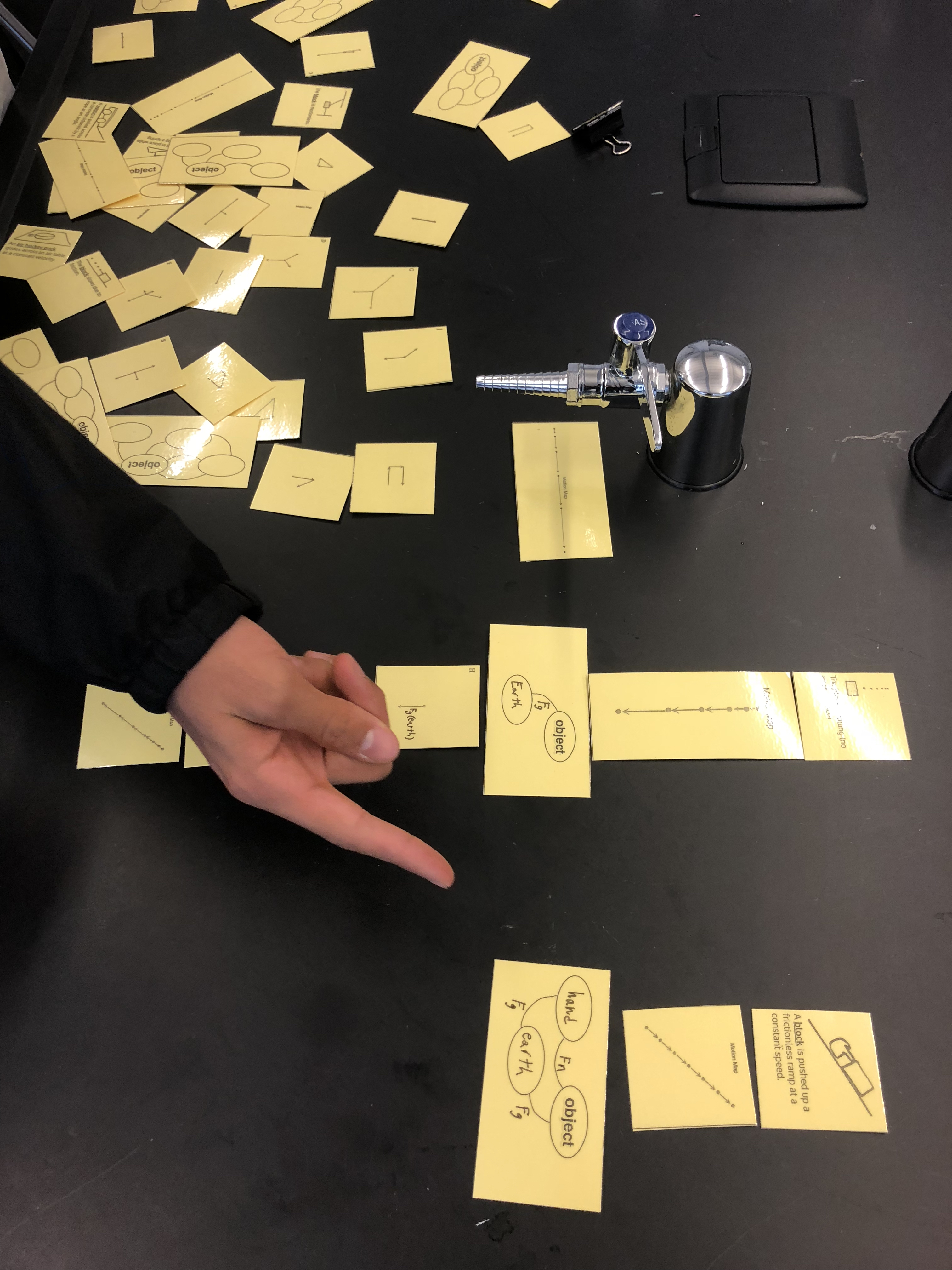 One new change to my intro physics class this past school year was to replace the set of FBD practice problems with a card sort that would be done in groups. The card sort gives students a chance to practice FBDs with some scaffolding (especially choosing between options rather than creating everything from scratch), and it introduces a new representation that I hadn’t shown them ahead of time (force vector addition diagrams).