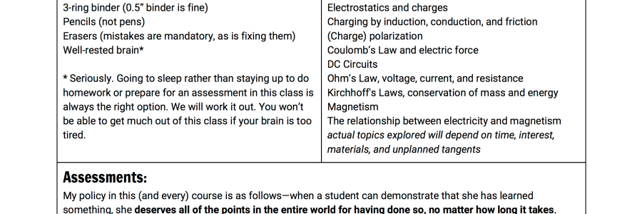 One of the classes that I am teaching this year is a one-trimester class for sophomores on E&M topics (a very basic class because of the short amount of time and because the students haven’t taken any mechanics). I get to teach it four times this year (twice in the first trimester) as every 10th grader… Read More Physics 10 Course Handout with Advice from Former Students